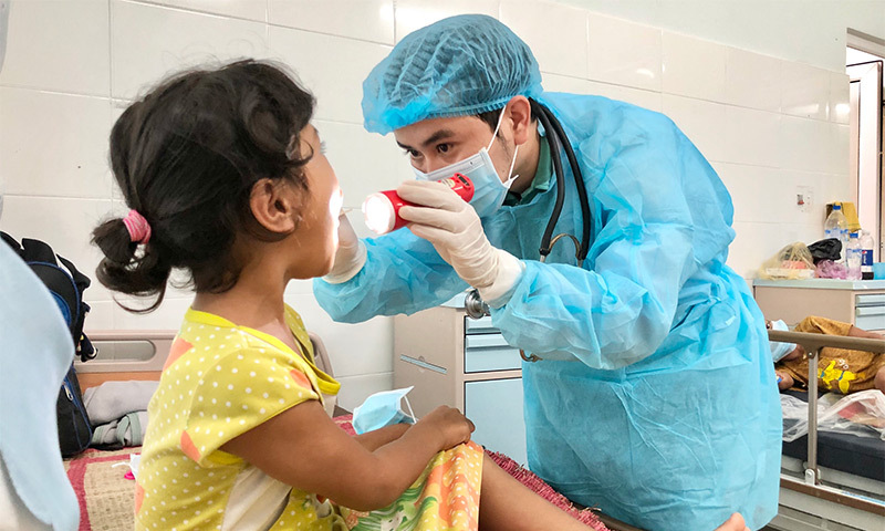 Bác sĩ tại Bệnh viện Phụ sản Quảng Nghĩa đã khám cho một bé gái mắc bệnh bạch hầu. Ảnh: Trần Phương .