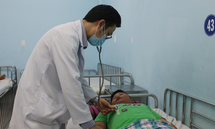 Bs T xem xét bệnh sốt xuất huyết ở trẻ em. Ảnh: Thứ Năm-Bệnh nhân sốt xuất huyết thường sốt cao liên tục khiến cơ thể mất nước. Nếu bệnh nhân ăn uống được thì có thể uống nhiều nước lọc, nước trái cây, dung dịch osol và ăn cháo xay để bù lại lượng nước đã mất. Đặc biệt đối với những trẻ nôn trớ nhiều, chán ăn, lười ăn thì cha mẹ phải đưa đến bệnh viện bác sĩ để điều trị.