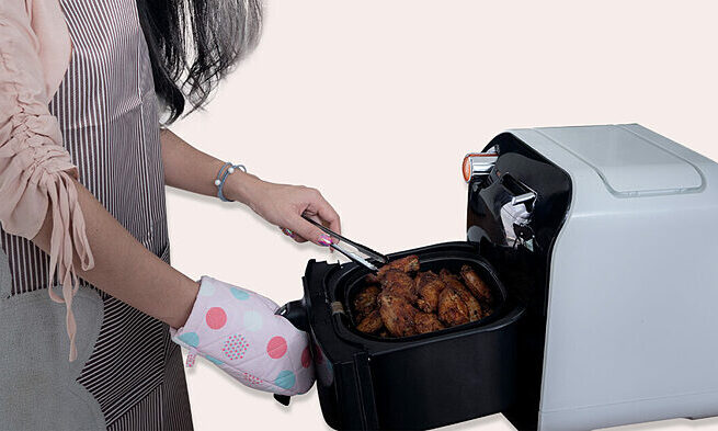 Nồi chiên không dầu hay còn gọi là nồi chiên không khí làm chín thực phẩm bằng cách nâng nhiệt độ lên 200 độ C, sau đó dùng quạt dàn đều trên bề mặt thực phẩm giúp thực phẩm chín đều và trông giòn. Khi nấu chín như cách chiên truyền thống, nó có thể loại bỏ nhiều chất béo từ thực phẩm.