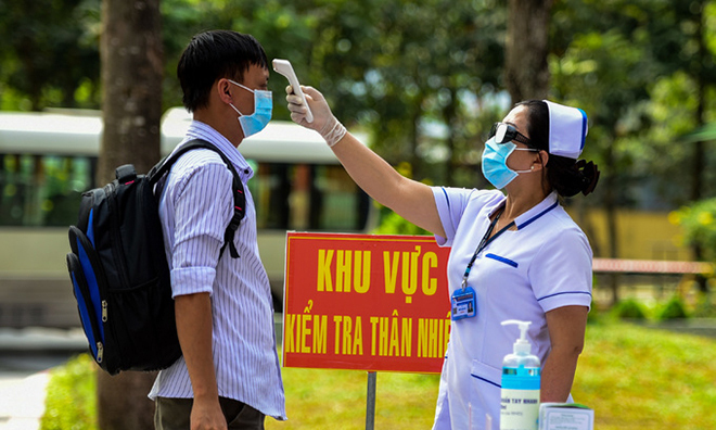 Nhiệt độ của các chất cách điện nên được đo mỗi sáng và tối để quan sát xem chúng có bị sốt hay không và theo dõi sức khỏe của chúng. hay không. Sốt xảy ra khi nhiệt độ cơ thể từ 37,5 độ C trở lên. Đồng thời, nếu bạn nhận thấy ho, khó thở hoặc bất kỳ vấn đề sức khỏe nào, vui lòng thông báo cho chuyên gia y tế ngay lập tức. Vào tháng 3 năm 2020, một bác sĩ đã lấy nhiệt độ của một dân số bị cô lập trong một buổi diễn tập để chứa 550 người tại Bệnh viện dã chiến Thành phố Hồ Chí Minh. Ảnh: Quỳnh Trần