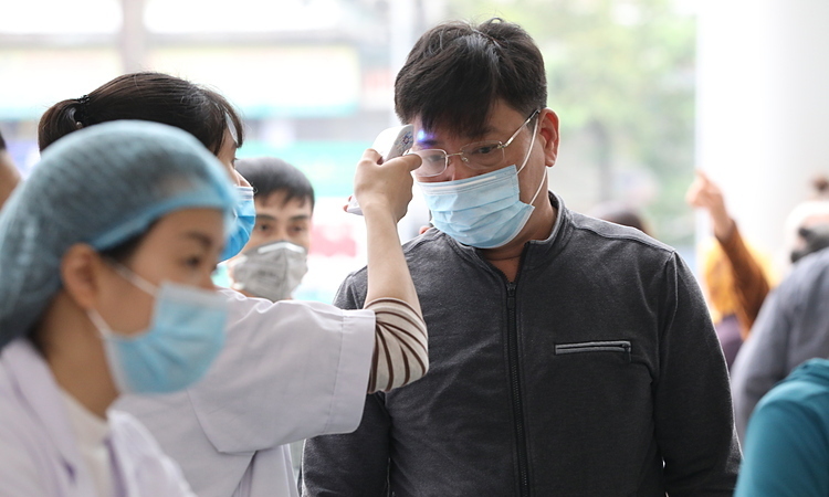 Nhân viên y tế ở bệnh viện K đo nhiệt độ của bệnh nhân và thân nhân của họ. Ảnh: Ngọc Thành .