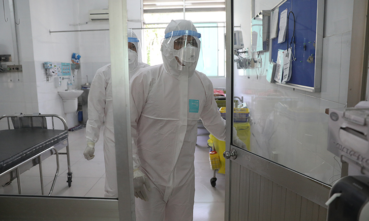 Nhân viên y tế trong khu vực cách ly trang trại cách ly. Ảnh: Hữu Khoa .